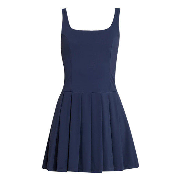 Serving looks on and off the court, is The Upside's Collette Mini Dress. Panelled mini dress with pleated skirt. Straight back straps and a scooped square neck. Contrast logo at back. Built in shorts with pocket. Internal shelf bra for extra support. Recycled soft peached with a brushed handfeel. Breathable, quick drying and extra soft. Moisture wicking.