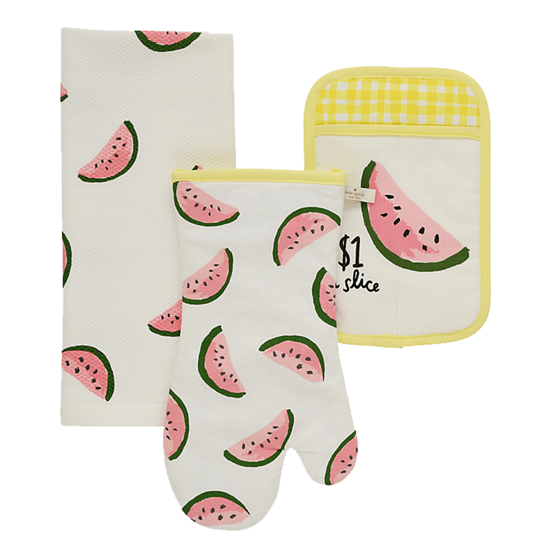 If your kitchen is in need of an adorable update, look no further than this set of 3 essentials: a printed kitchen towel, an oven mitt, and a pot holder. Perfect for a rustic farmhouse, but just as delightful in an urban kitchenette.